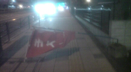 K子の家に向かう途中、歩道に遮断機が…!と思ったらモスの旗デシタ。
